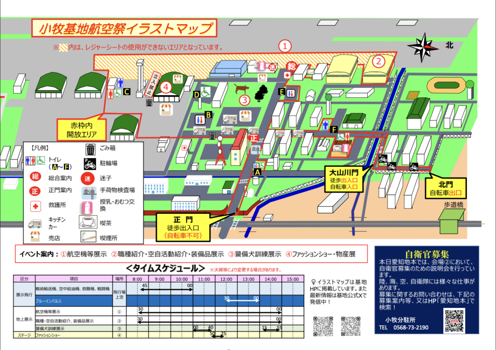 小牧基地航空祭では、基地内の赤枠部分がメインの観覧エリアとして一般開放されます。
